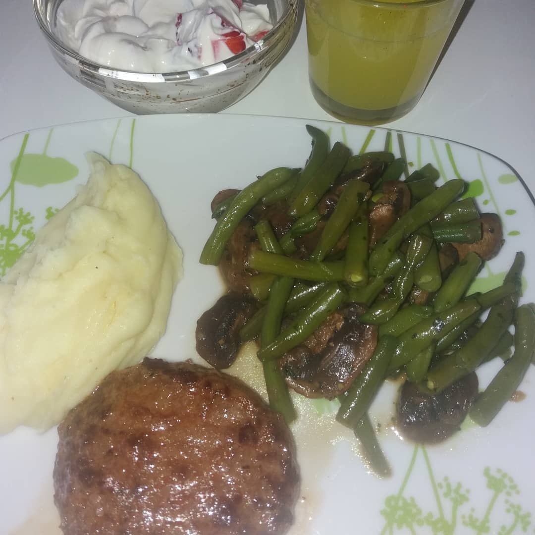 Ce midi : purée, haricots verts/champignons, steak haché, petits suisses et fraises.
