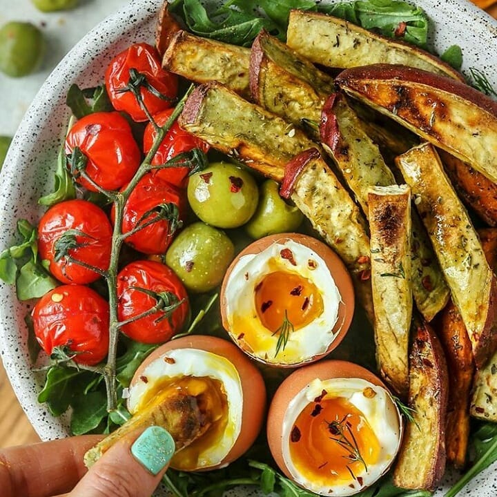 Deets: Japanese sweet potatoes cut into fries, tossed in coconut oil and seasoned with Zataar seasoning. Baked on 425 for about 30 minutes, flipping half way. Paired with arugula, olives, roasted tomatoes and @vitalfarms soft boiled eggs. Garnished with fresh dill and red pepper flakes. •