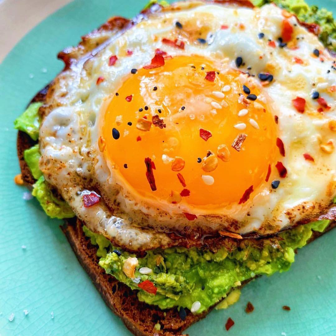 1. Avocado ? Toast with Kale Cashew Pesto and a fried egg ? with truffle salt, bagel seasoning, and crushed red pepper ?
