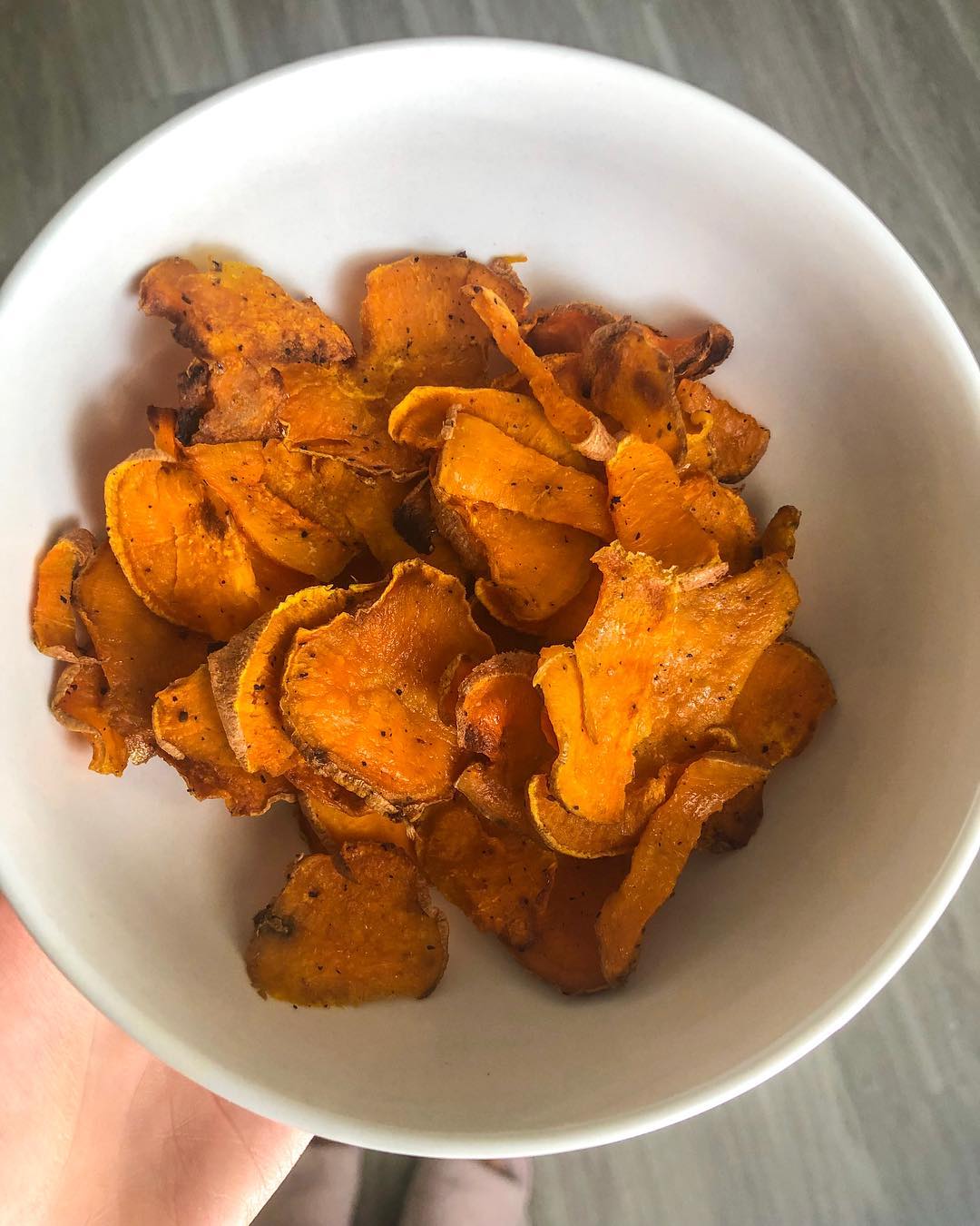 Deets: 1 large sweet potato thinly sliced and seasoned with 1 tbsp olive oil, himalayan pink salt, pepper, garlic powder & @traderjoes chili lime seasoning✨ preheat oven to 400 F, lay sweet potato slices evenly (not on top of each other) out on the sheet and bake for 20-25 mins. Let them cool for a couple of minutes & enjoy?