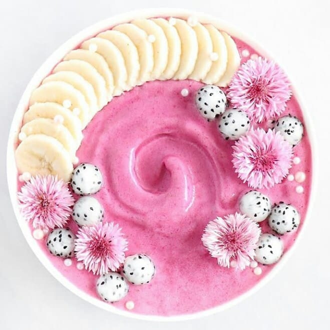 This bowl is a blend of two frozen bananas + half a frozen pitaya packet + 1/4 tsp vanilla powder (or 1/2 tsp vanilla extract) + a half cup coconut milk. I topped it with banana, white dragonfruit, and flowers ? I hope you all have a wonderful day! By@purelykaylie