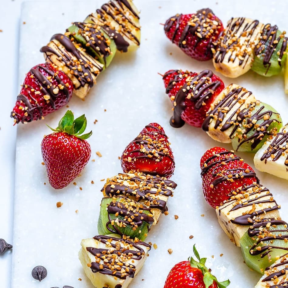 Lightly drizzle the kabobs with melted chocolate, then sprinkle with nuts and enjoy immediately or refreeeze for an hour or two until ready to serve.