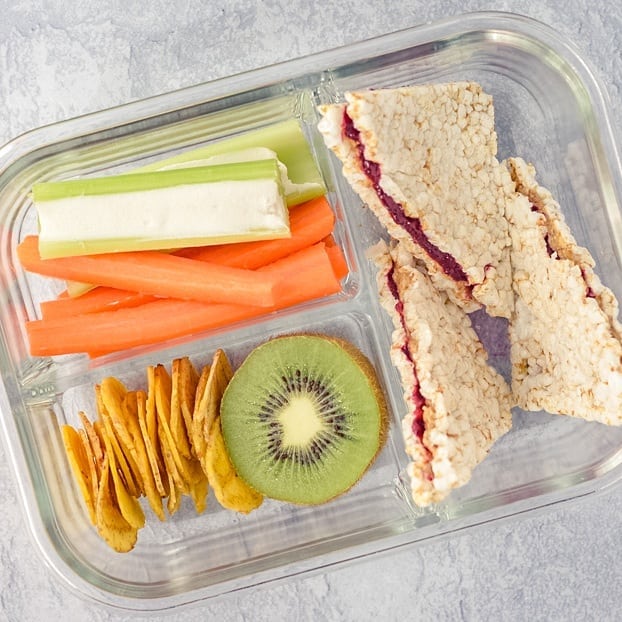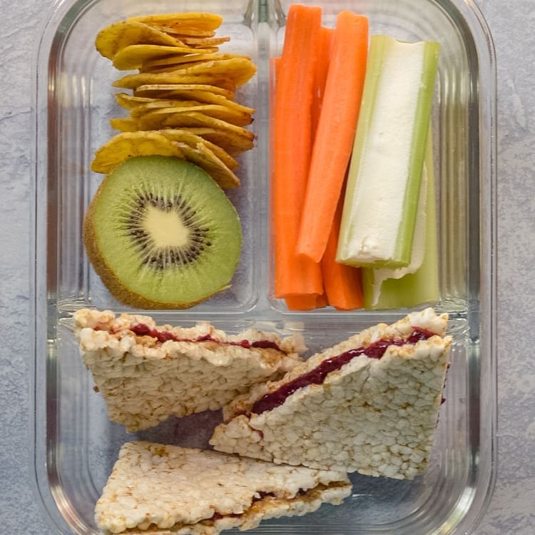 organic brown rice cakes (I used Thin Stackers by Lundberg), with almond butter and fruit only jam