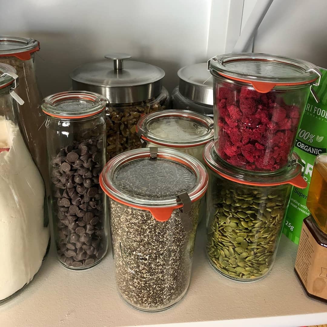 I like to keep Oatmeal that I purchased on sale, all-natural granola, protein powder, lots of raw nuts like pecans, walnuts, and almonds (I find that Costco has the best prices on nuts!) chia seeds, dried coconut, and other dried fruits.