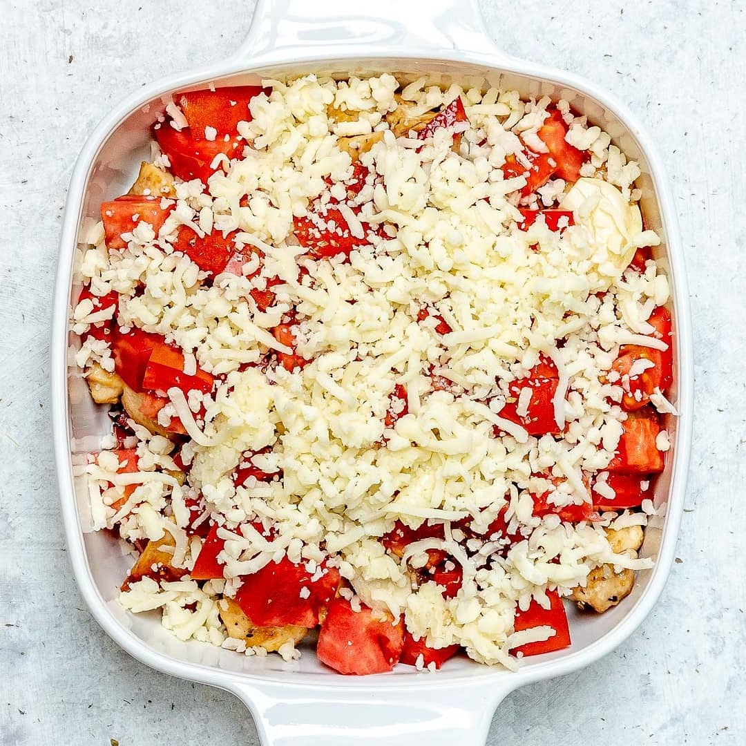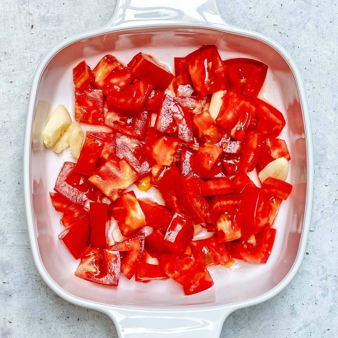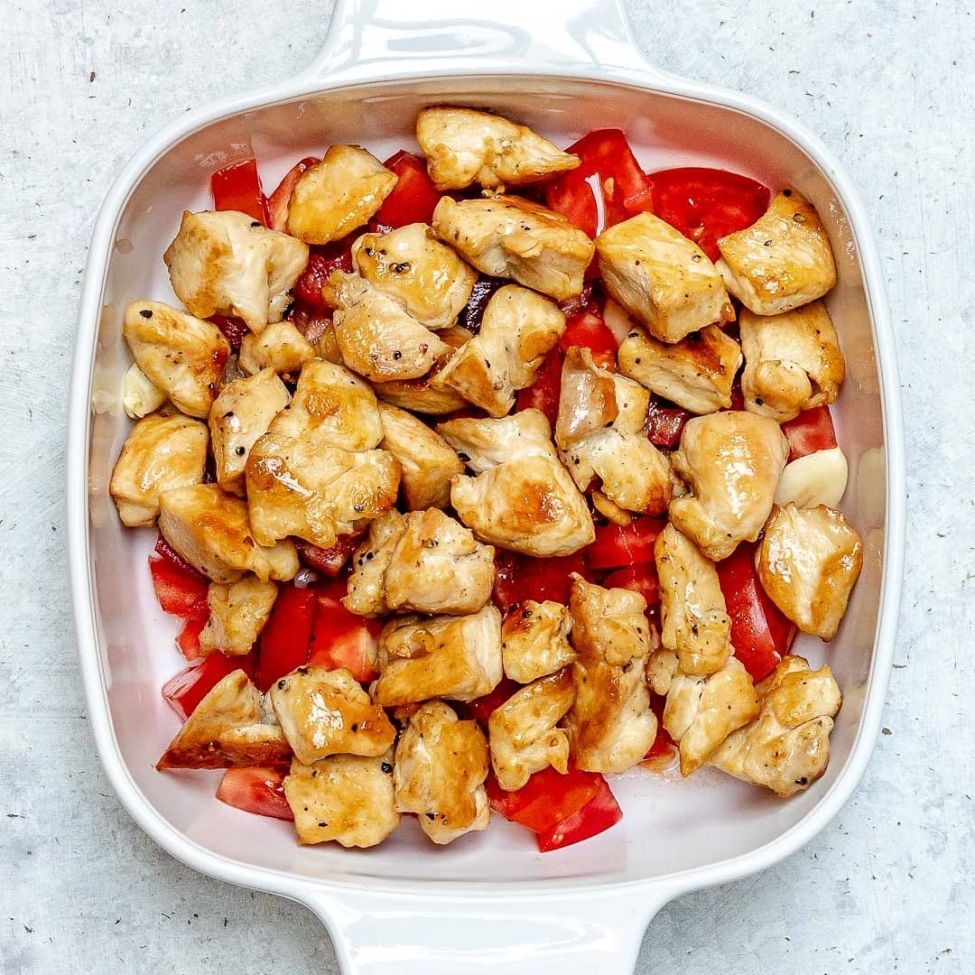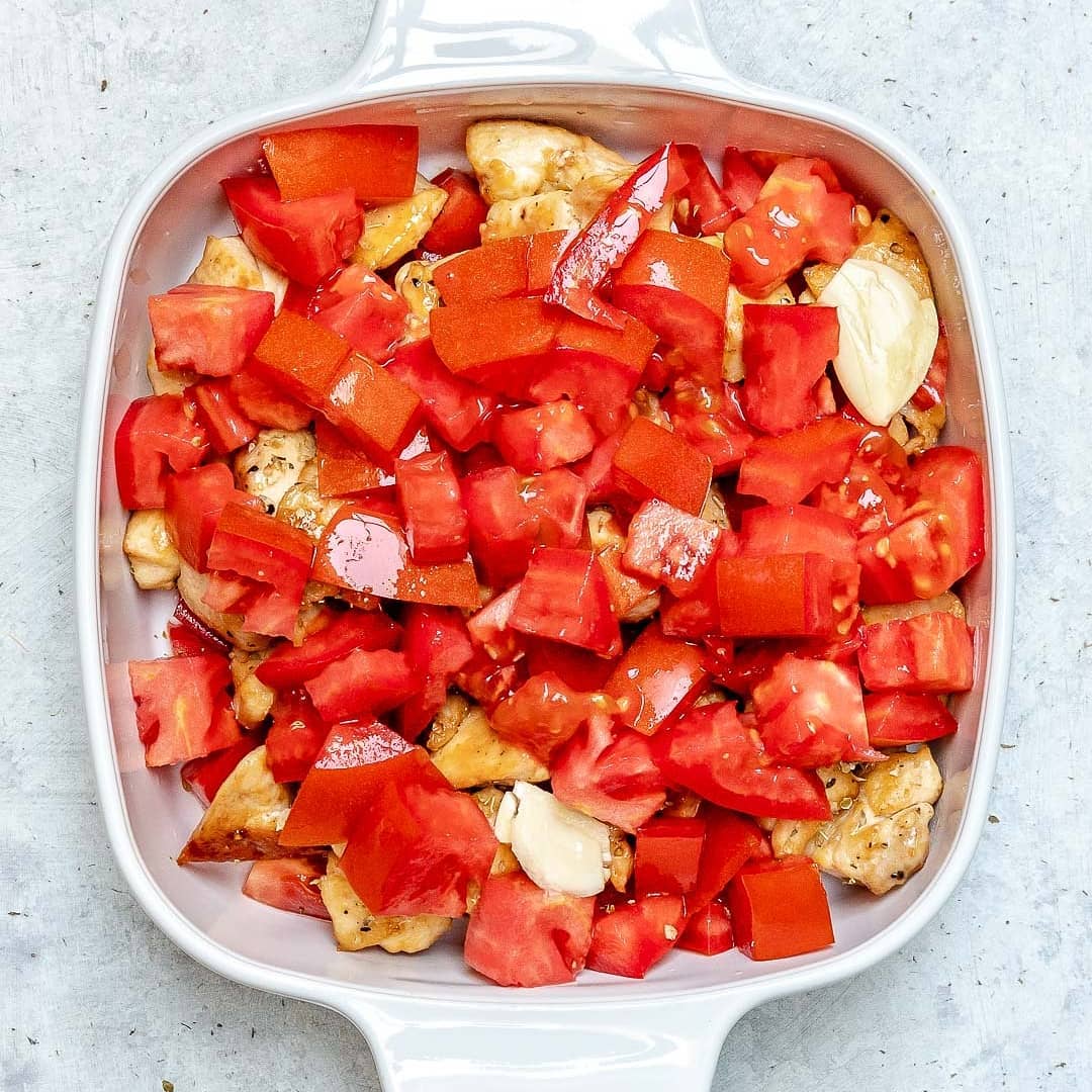 Transfer the chicken to a 8×8 baking dish (sprayed or brushed with oil to prevent sticking), top with chopped tomatoes, oregano, garlic and a drizzle of balsamic vinegar.