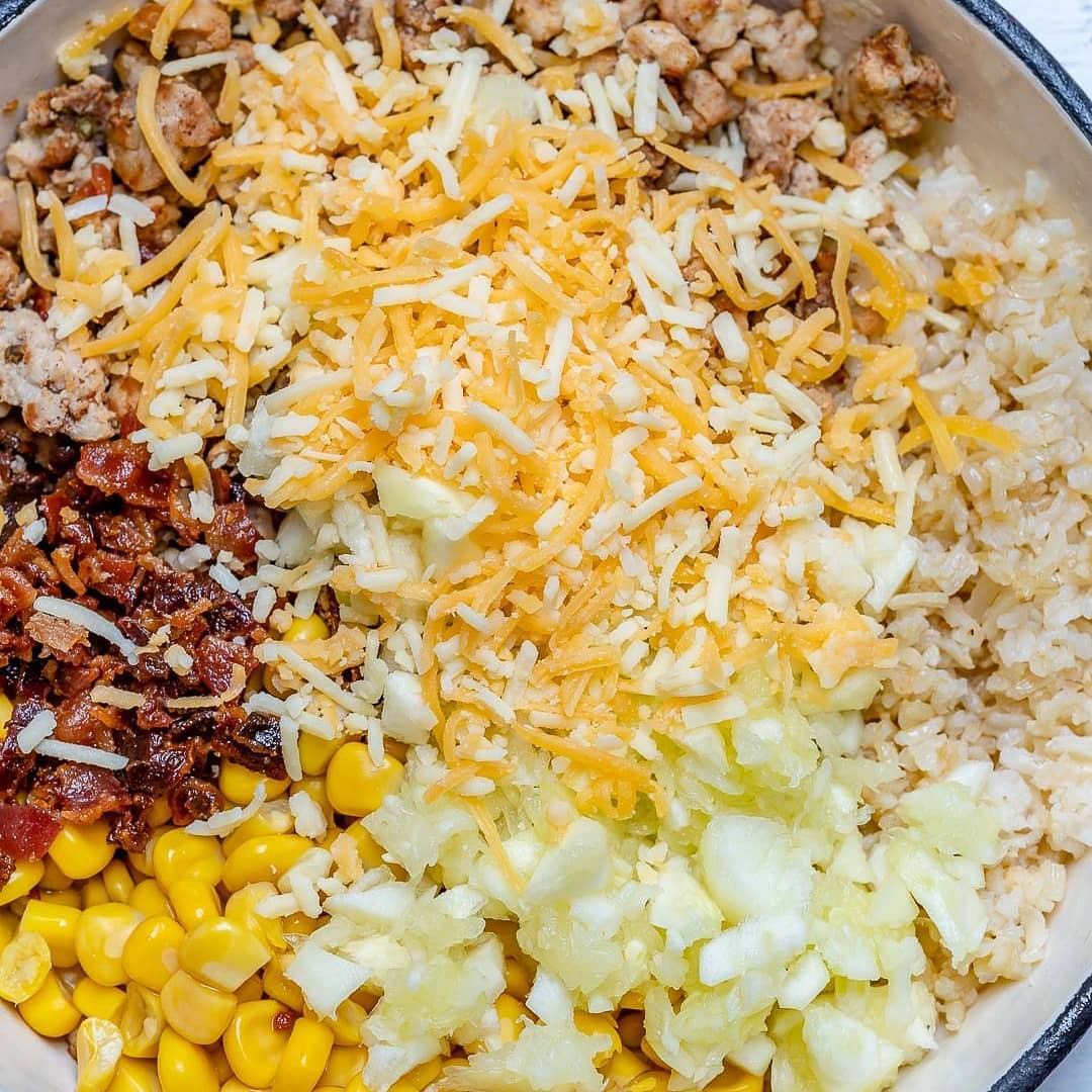 Take pan off the stove, then add in your corn, cooked brown rice, bacon, 1/4 cup of cheese, and the remaining zucchini flesh.
