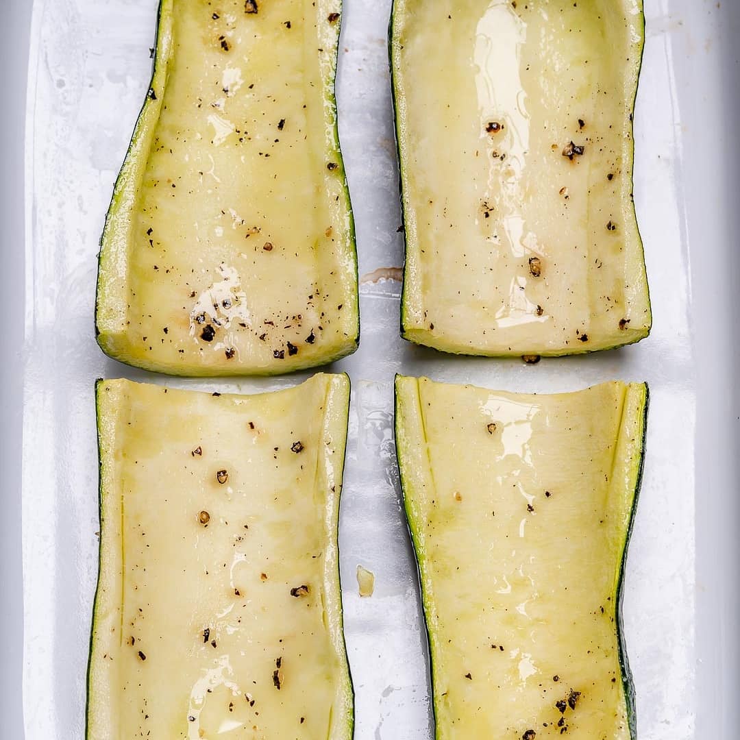 Place zucchini halves, cut side-up, into the bottom of 9”-x-13” baking dish and lightly spray or rub with cooking oil; season with sea salt and pepper, then bake just until zucchini begins to soften, about 10-12 minutes.