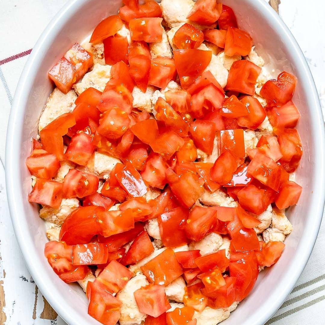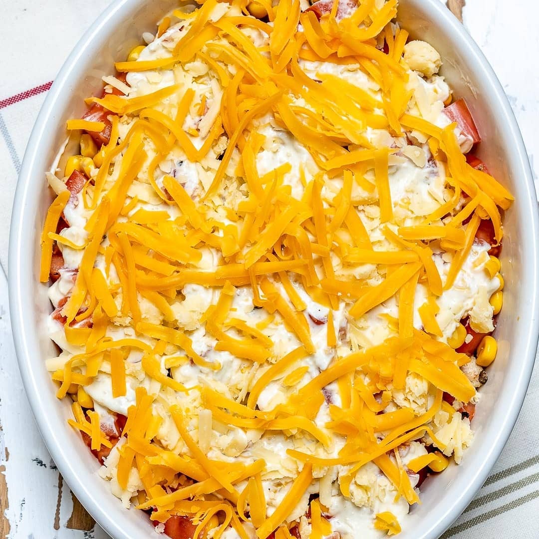 Add cooked chicken pieces into your baking dish in a single layer, then sprinkle with tomatoes and corn. Spread remaining creamy mixture and top with shredded cheese.