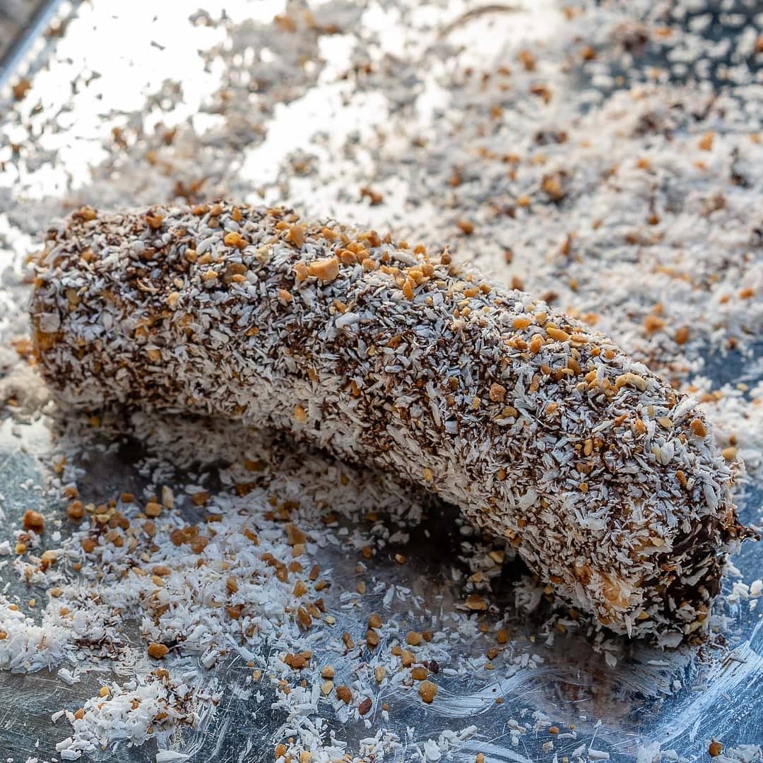Then, roll them into the coconut-nut mixture, then place them on a plate, or cutting board.