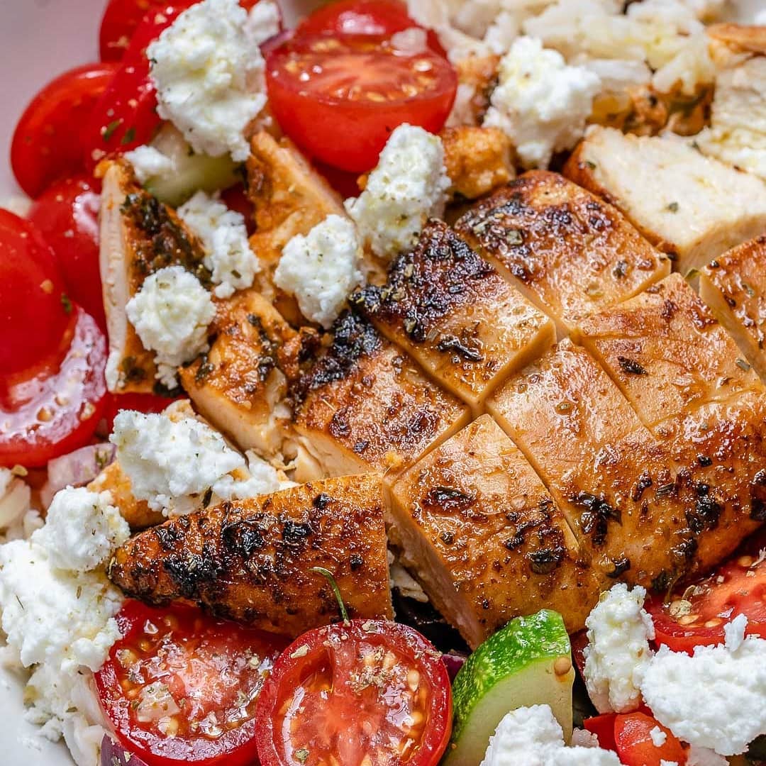 To assemble your bowls, add a 1/2 cup cooked rice to 3, 1-serving bowls or food prep containers, then top equally with your Greek salad, and chopped chicken.