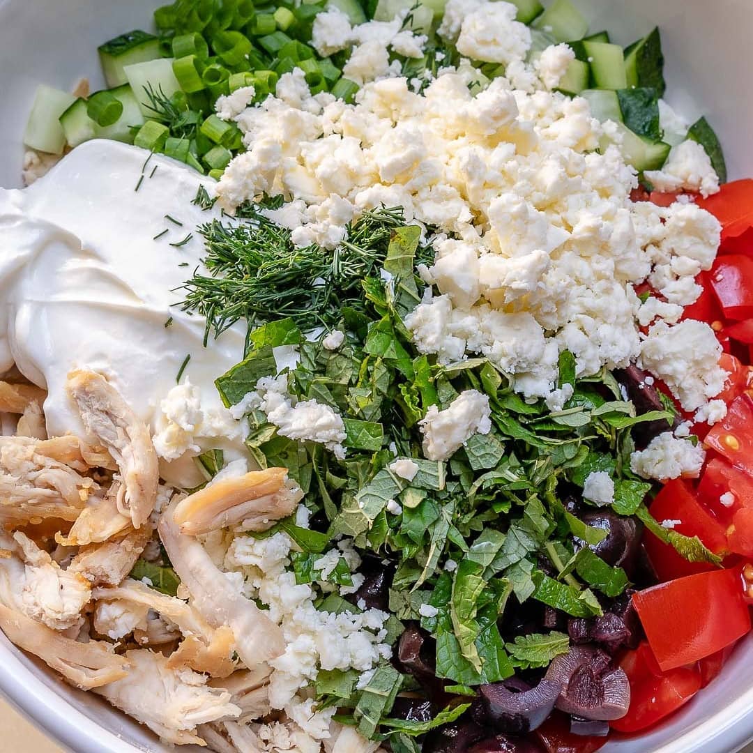 In a medium bowl, combine shredded chicken, tomatoes, cucumber, olives, onions, cheese, garlic, lemon juice and zest, oregano, dill and yogurt.