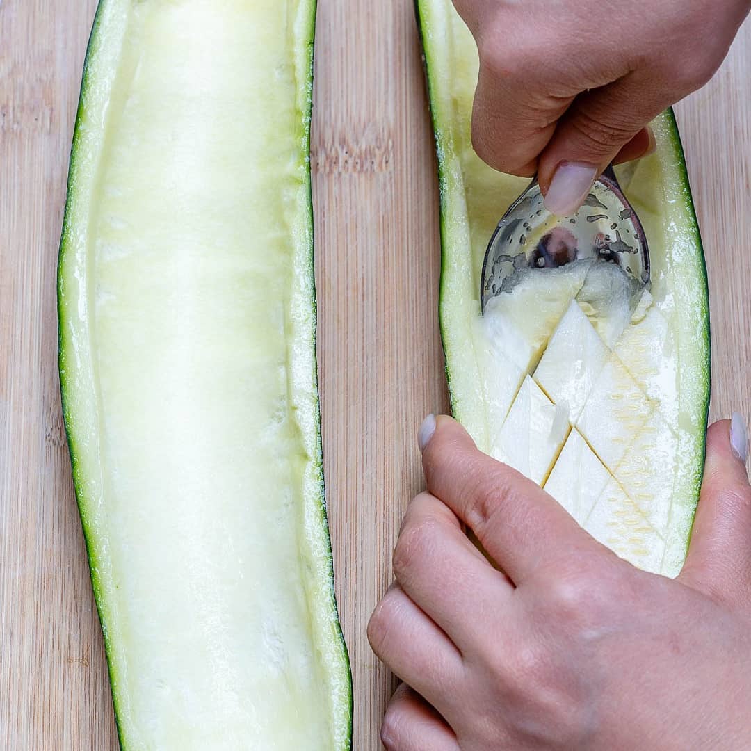 Slice your zucchini in half, lengthwise, then scoop out the inside flesh, still leaving good solid “boats”. Place the zucchinis cut side up onto your prepared baking tray, then spray or brush lightly with cooking oil. Season with sea salt and pepper to taste, then bake until just beginning to soften, about 10 minutes.