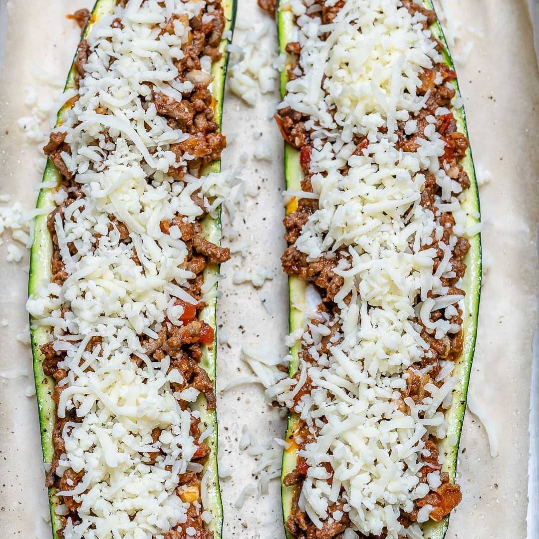 To stuff the zucchini boats, add a very thin layer of ricotta, or cottage cheese into the bottom of the zucchini boat, then fill with your meat mixture, and finally sprinkle each lightly with shredded mozzarella.
