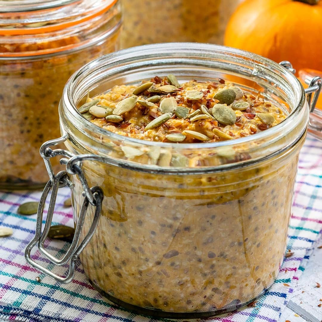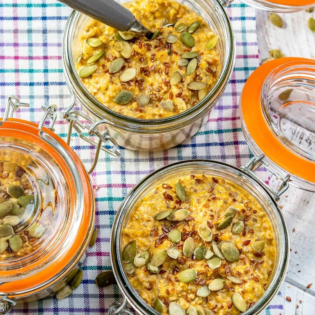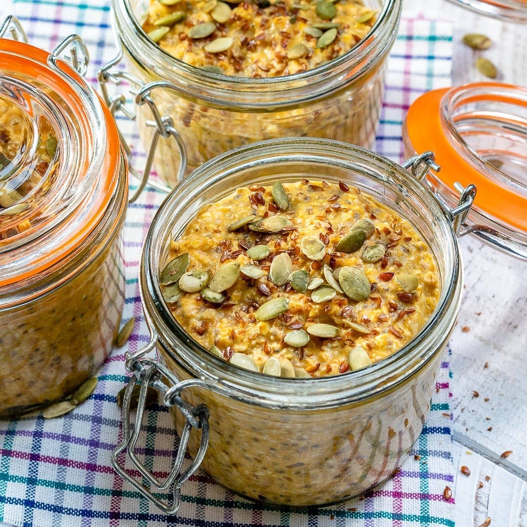 Divide your oats mixture among 4 small mason jars, sprinkle with your pumpkin and flax seeds.