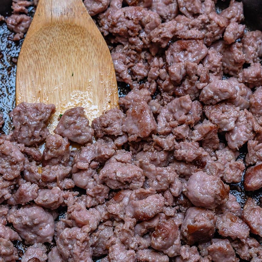 Heat a large skillet over medium high heat and cook your ground beef breaking it into small pieces with a wooden spoon as it cooks.