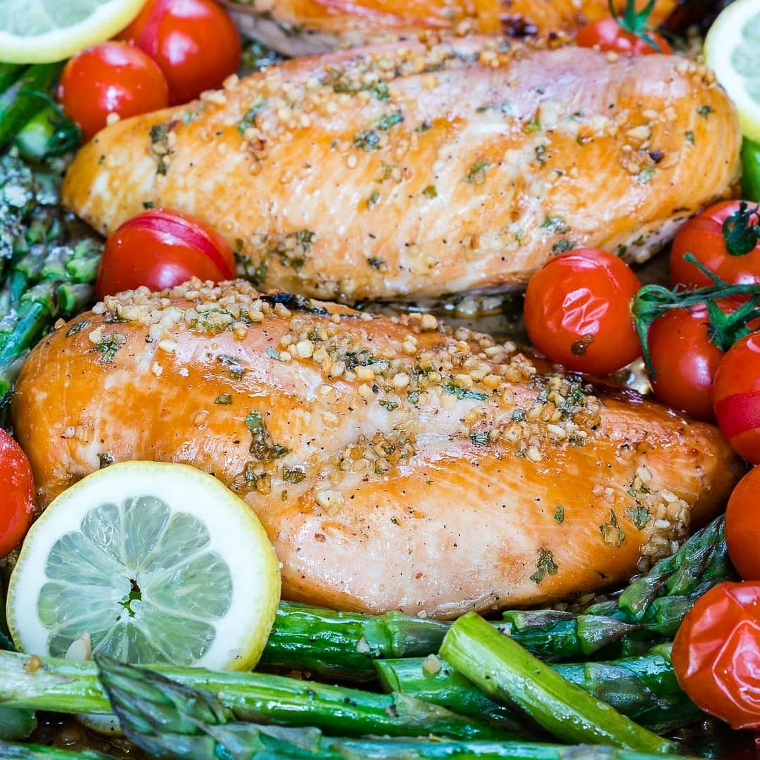 Bake for 20 minutes in your preheated oven, or until the chicken is cooked through. Arrange the asparagus and the cherry tomatoes around the chicken. Drizzle with extra virgin olive oil and season with salt and pepper. Return to the oven to oven on “broil” until the chicken is golden, and the asparagus is cooked, about 6-8 minutes.