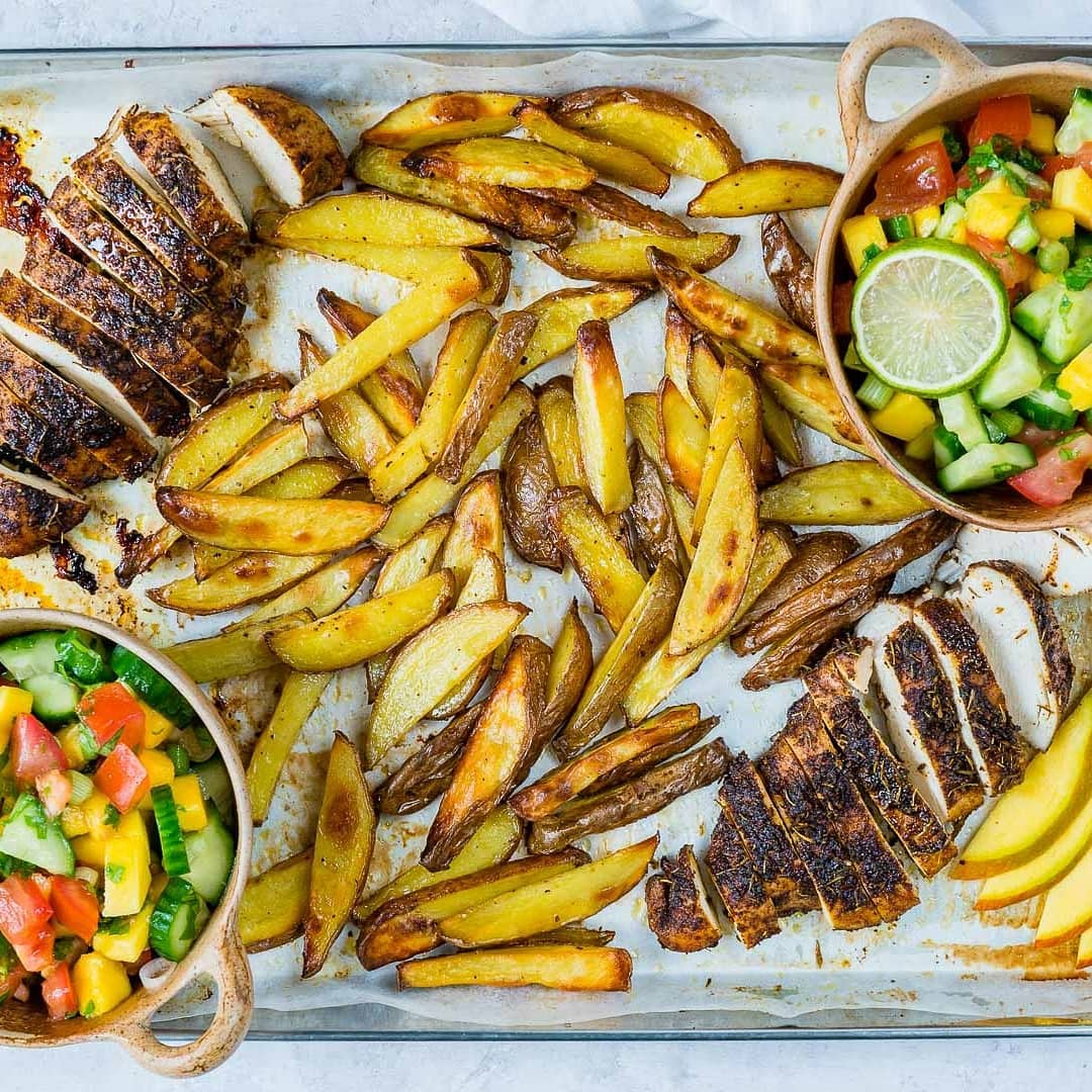Sheet Pan Jerk Chicken with Baked Fries + Fresh Mango Salsa ????
