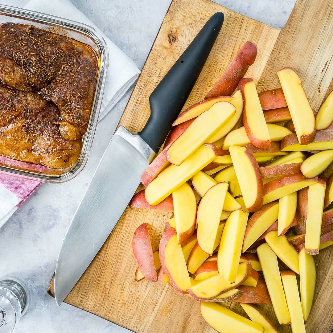 Arrange the potatoes on the sheet pan, in a single layer. Add the chicken and roast in the preheated oven for about 20 minutes turning fries once during baking, or until the chicken is cooked through and the fries are crispy.