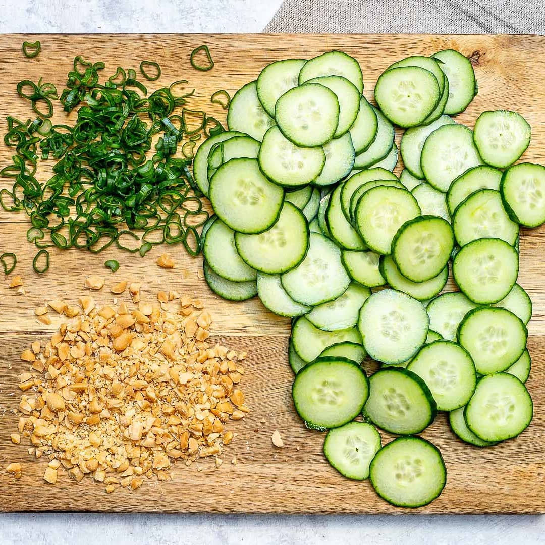 2 large English cucumbers, thinly sliced, I like to leave the peel on