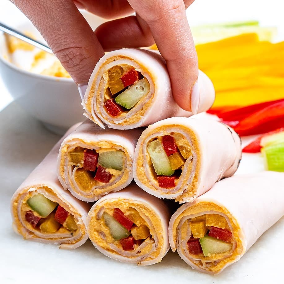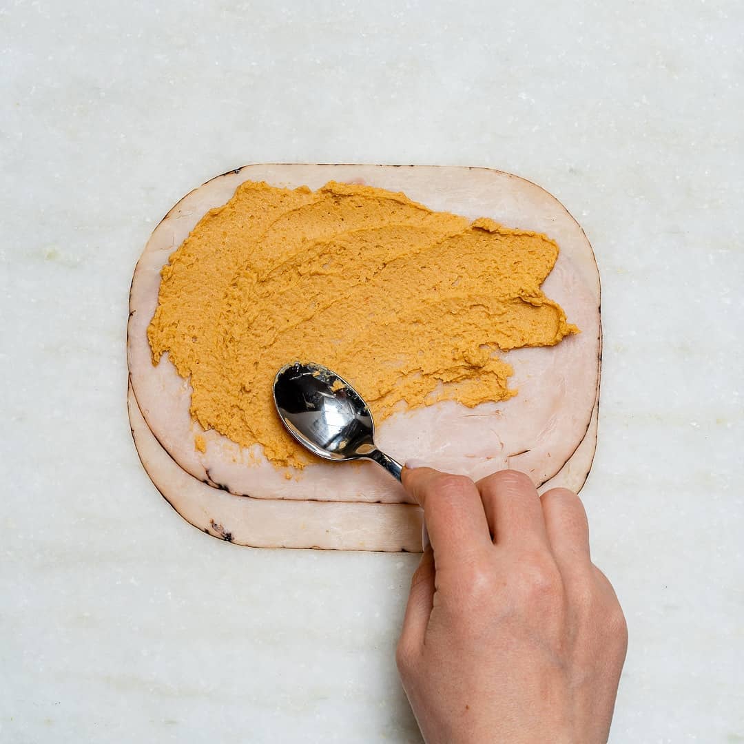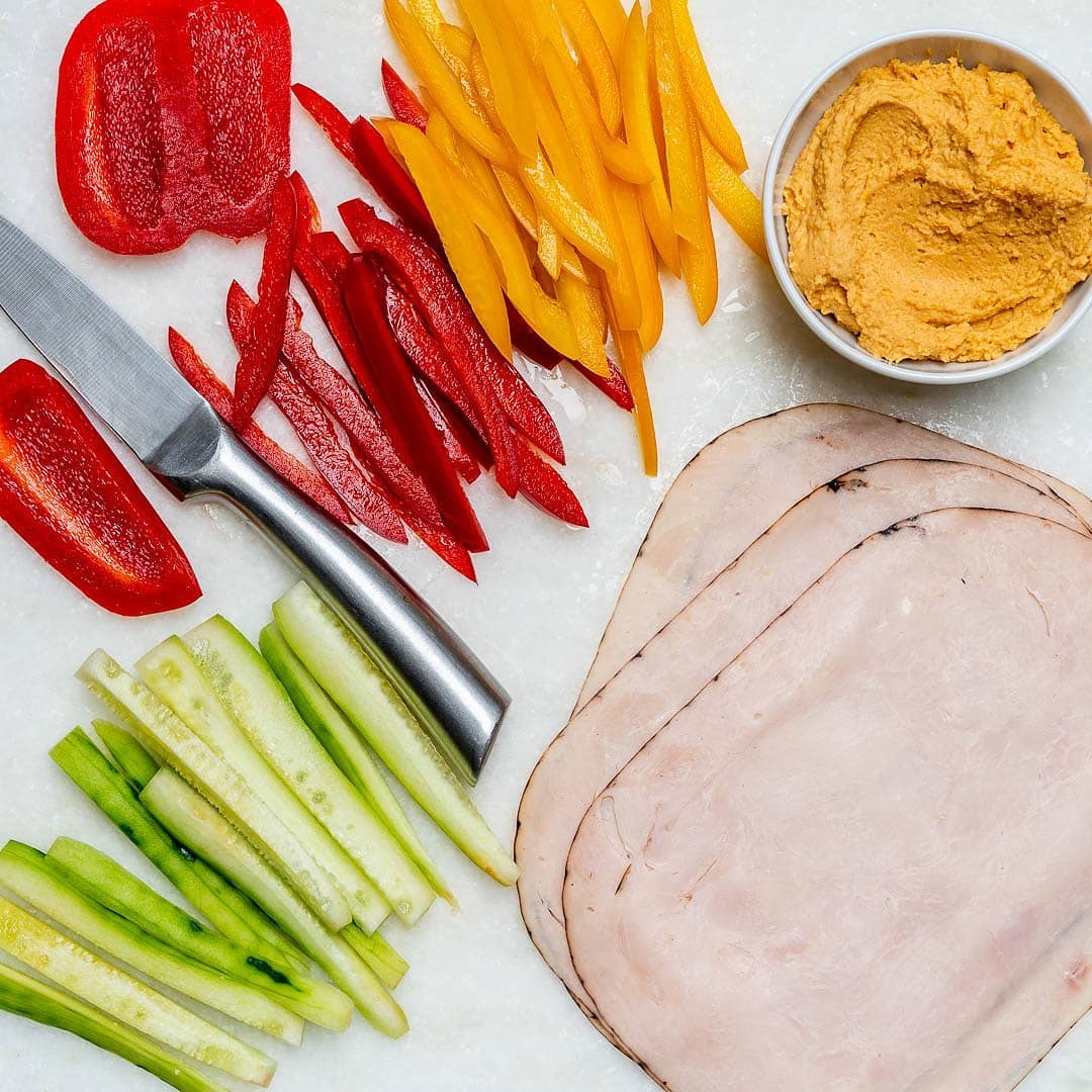 Spread hummus on a slice of deli turkey (make it 2 slices if it’s really thin). Add strips of peppers and cucumber as shown.