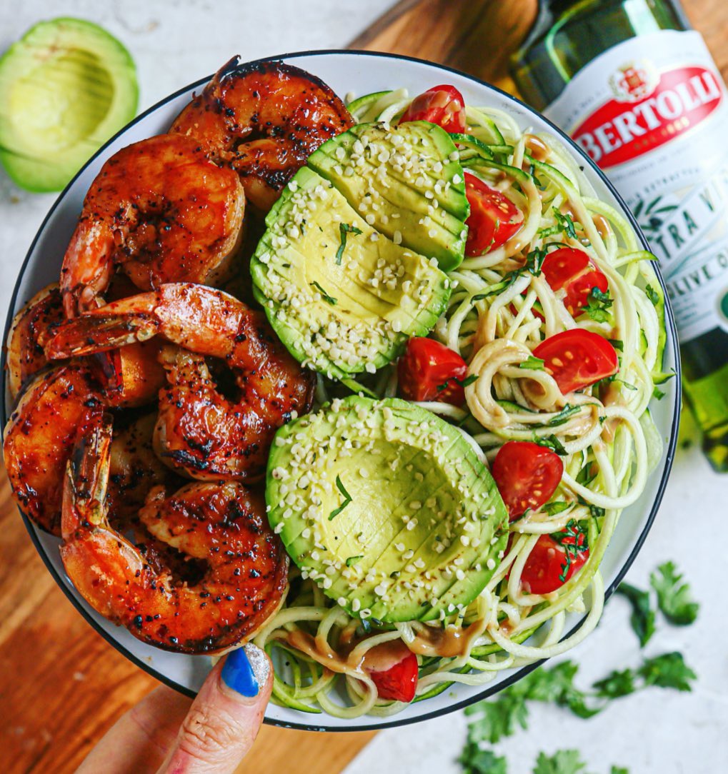 BBQ SHRIMP and CREAMY BALSAMIC MUSTARD ZOODLE SALAD! Happy Tuesday all. I hope you’re having a great week. Made this meal for my boyfriend and I to split for lunch the other day and it was DELICIOUS. Super easy to make too. I seared the shrimp in @bertolli_us olive oil, because it’s my favorite….high quality and flavorful. Did you know that the type of soil used for your olives will impact the flavour and quality of your oil? Bertolli ensures that their soil has the perfect amount of water to protect the soil’s moisture under the sun! So the farmers are able to get the best quality! Happy Tuesday loves! Off to get some work done •