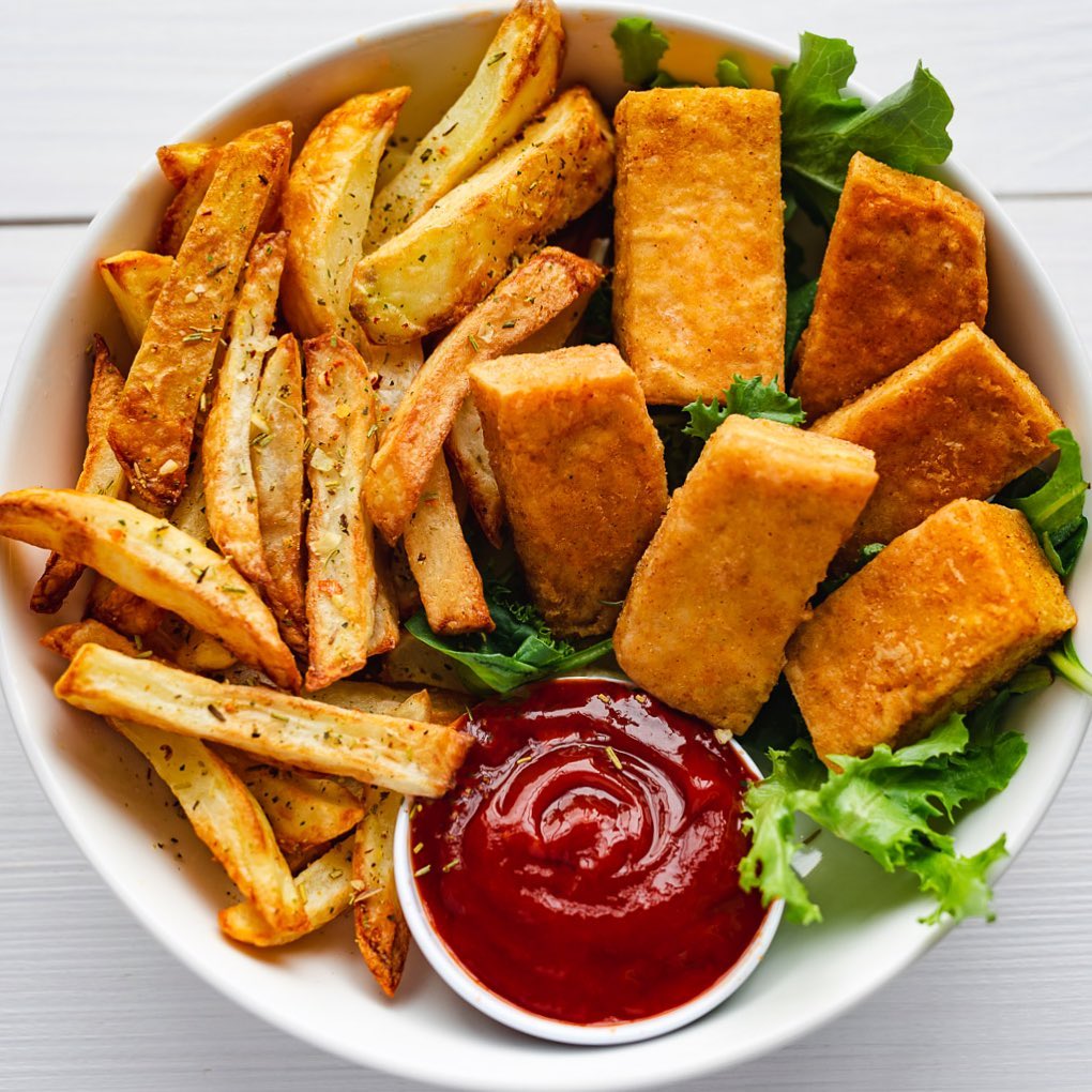 ?Recipe: slice 1-14oz packet extra-firm tofu into approximately 1/2-to 3/4- inch thick rectangles. Freeze on baking sheet overnight. (You can freeze as is in original packaging but it takes longer and I don’t find it as effective.) Thaw at room temperature before gently pressing to remove excess liquid. Season with salt and pepper. Mix: 1/2 cup all-purpose flour, 3 tbsp nutritional yeast, 1 tsp Cajun seasoning (or your favorite seasonings…ex. garlic powder, chili powder, cayenne, paprika), 1 tsp salt, 1/2 tsp black pepper. Cut tofu rectangles into 1/2-inch wide sticks. Roll tofu in flour mixture twice to get sufficient coating. Heat neutral oil to frying pan. (Should be enough oil to reach half way up the sides of tofu sticks.) Pan fry tofu in hot oil until crispy on each side. (Served with sriracha ketchup and fries.)