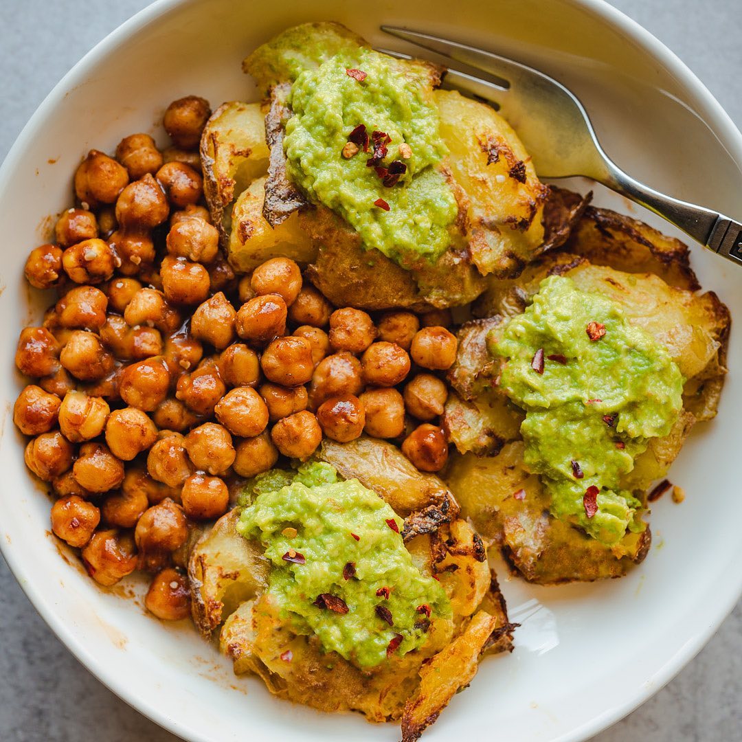 ?Crispy smashed potatoes with avocado and BBQ chickpeas? ?Yes…this is extremely delicious. You WILL overeat!