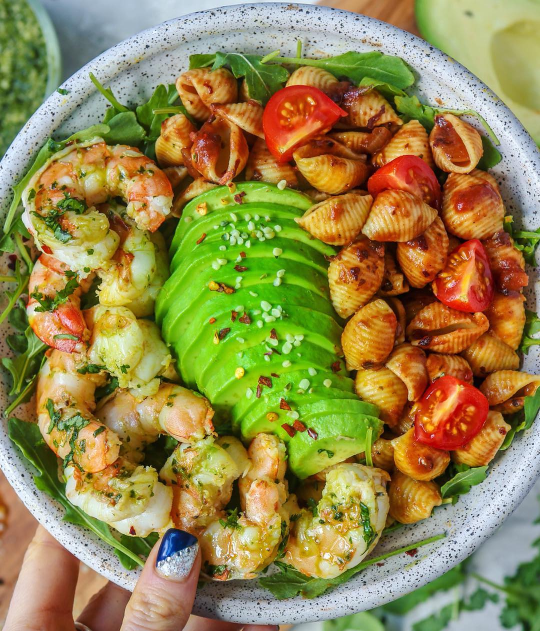 2️⃣ Wild shrimp with cilantro lemon pesto, @eatbanza pasta with Black Bean Tomato SAUCE: 1 jar black bean dip, 1 can crushed organic tomatoes, 1 cup water, 1/2 teaspoon salt, 2 teaspoons cumin, 1 teaspoon chili powder, 1/2 onion chopped and 2 cloves of garlic. Sauté the onions and garlic for a couple minutes on medium high, add the rest of the ingredients and reduce heat. Add water if you need!