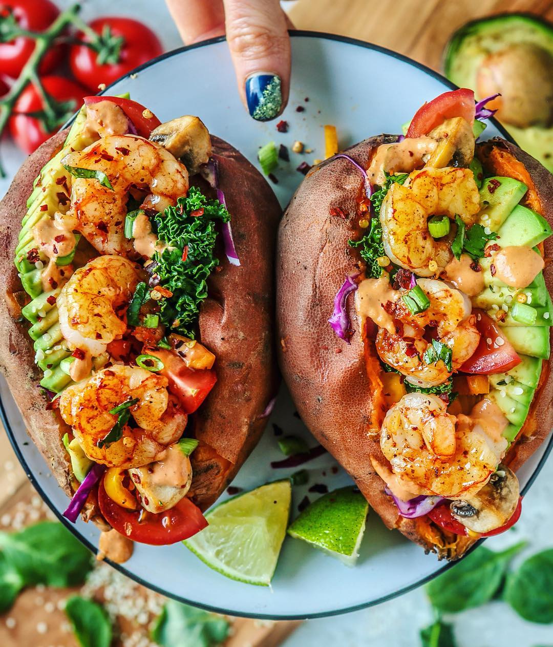 1️⃣ 2 large sweet potatoes with steamed kale, tomatoes, sautéed mushrooms, chopped pepper, avocado, scallions, cilantro, 1/2 pound of wild shrimp tossed in 1/2 teaspoon of turmeric, 1 teaspoon cumin, dash of chili powder, salt, pepper, dash of coconut aminos and juice from 1/2 lime…sautéed in coconut aminos for about 2 minutes per side. Topped with a spicy tahini sauce