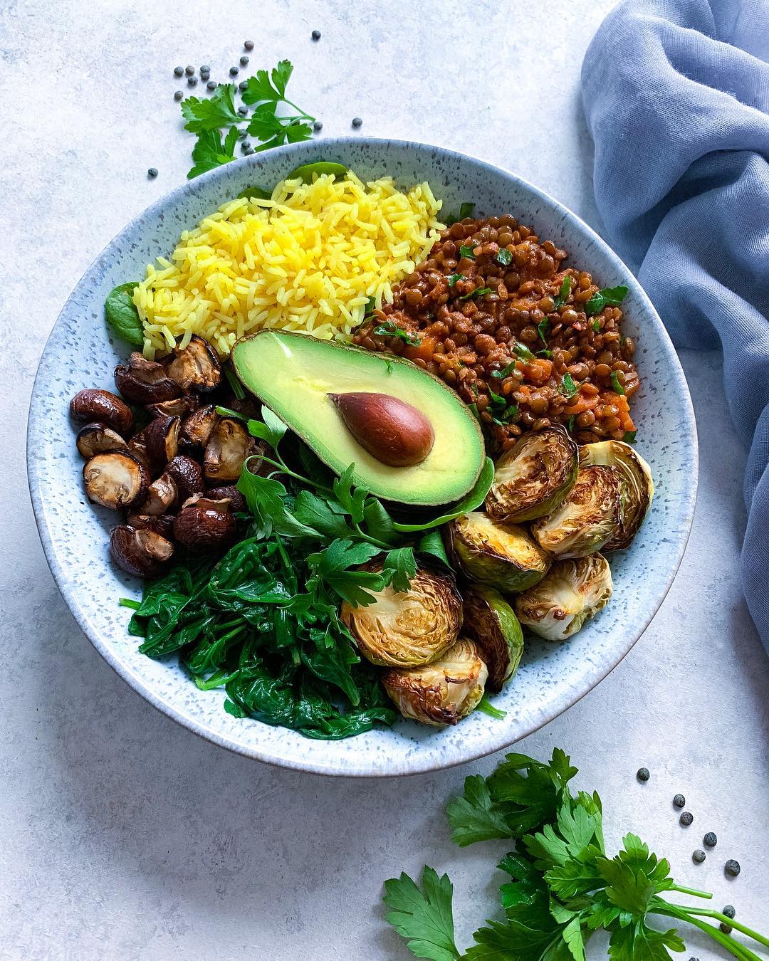 In my bowl: pilau rice, lentil curry, roasted sprouts, roasted mushrooms, kale and ?