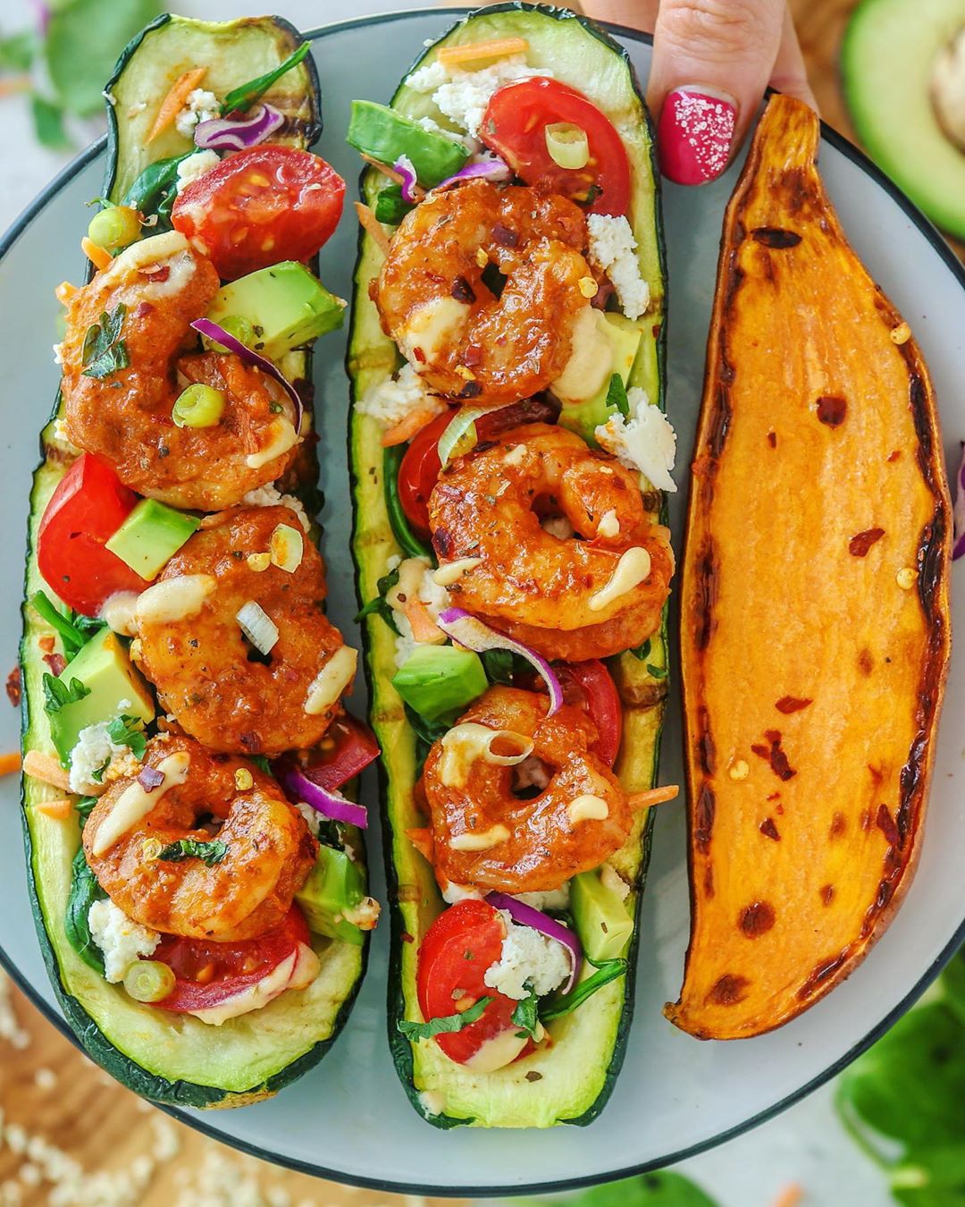 Deets: slice zucchini down the middle, trim ends and scoop out the flesh. Brush with oil and place face down on rack in oven. Bake for about 10 mins before flipping. While the zucchini is cooking, sauté some spinach with salt and pepper and boil some shrimp. Toss the shrimp in some buffalo sauce (if you don’t have any you can mix 1/4 cup of hot sauce with 1-2 tablespoon warm ghee, 1/2 teaspoon garlic powder, 1 tablespoon coconut aminos and 1 teaspoon apple cider vinegar and blend.) take zucchini out after another 10 mins and stuff with spinach, @kitehillfoods dairy free cream cheese, tomatoes, avocado, Scallions, cilantro, red onion and drizzle with tahini. Serve with a half baked sweet potato. •
