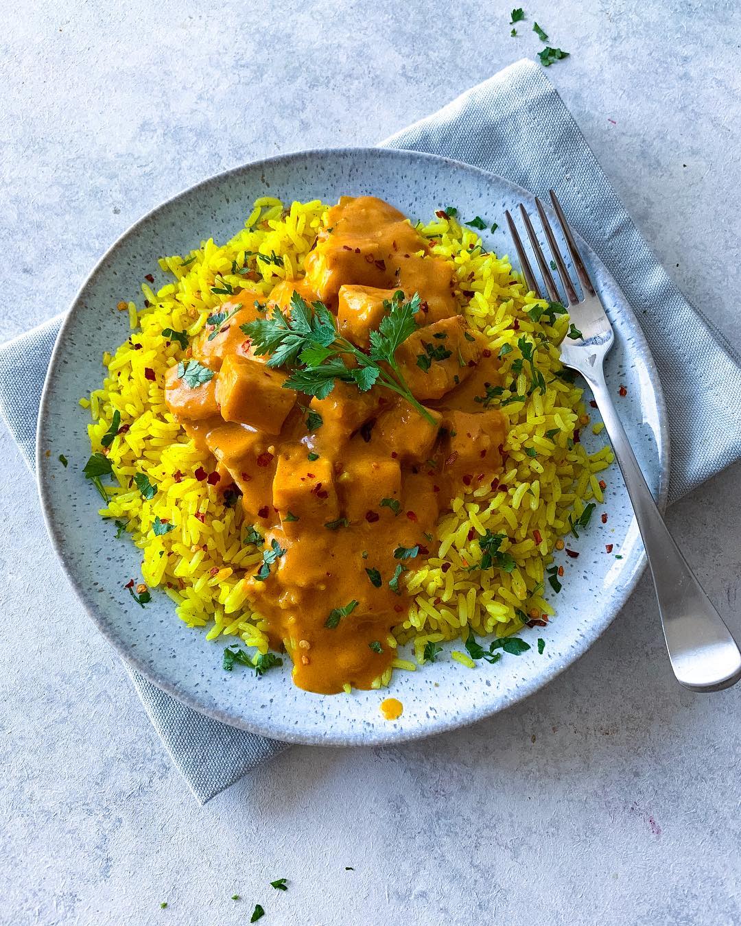 {1✨}Place the tofu on a parchment paper, season with a pinch of salt and bake in the oven at 200ºC for 20-25 minutes until golden brown then set aside. Alternatively, shallow fry until golden then set aside. {2✨} Heat a small splash of water or oil in a pan, add the shallots and cook until translucent. Add the garlic and curry powder and fry for 30 seconds then add the passata, vegetable stock and chilli powder. Stir well then cook on medium heat for around 10 minutes, adding small splashes of water if the pan gets too dry. {Continued in comments}