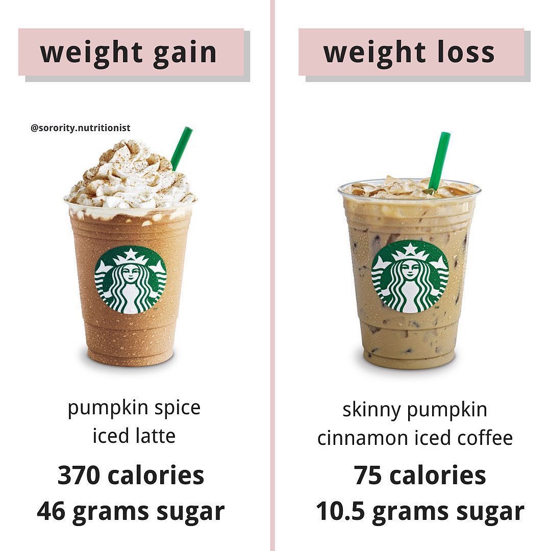 ??On the right is a grande skinny pumpkin cinnamon iced coffee (75 calories, 10.5 grams sugar)