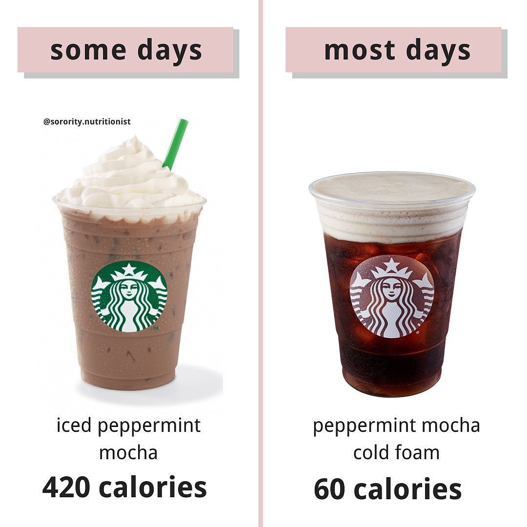 ?To order the lower calorie mocha situation, get a grande cold foam cold brew and ask for 1 pump skinny mocha in the coffee, then ask for 1 pump peppermint in the cold foam. If your store doesn’t have skinny mocha, get 1 pump regular mocha (adds an addition 20 calories)
