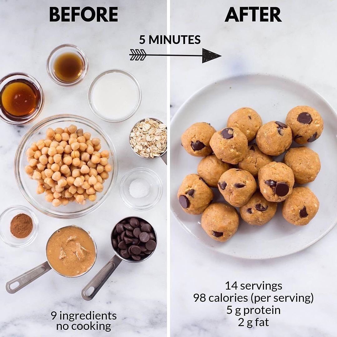 Add all ingredients to a blender. 1 1/2 cups chickpeas + 1/2 cup pb + 1/4 cup rolled oats + 2 tsp vanilla extract + 2 1/2 tbsp pure maple syrup + 1/2 tsp ground cinnamon + 1/8 tsp sea salt + 1 tbsp almond milk. Stir in 1/3 cup dark chocolate chips. Divide into 14 portions.