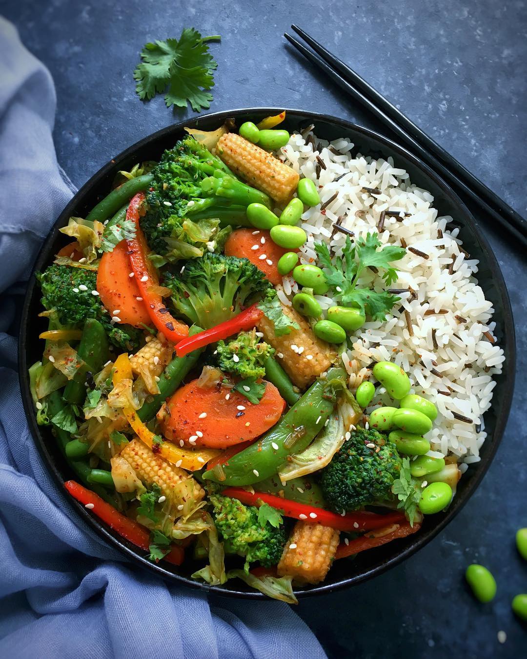 To make the ‘stir-fry’ I sautéed garlic and onions in a splash of water. I added vegetable stock and a splash of dark soy sauce. I let that simmer for a few minutes then I added part-cooked vegetables and a little chilli. I cooked for a further few minutes then add a a couple of tablespoons of cornflour (diluted in water) to thicken the sauce. I adjusted seasoning as needed then served with rice and a couple tablespoons of edamame ✌?