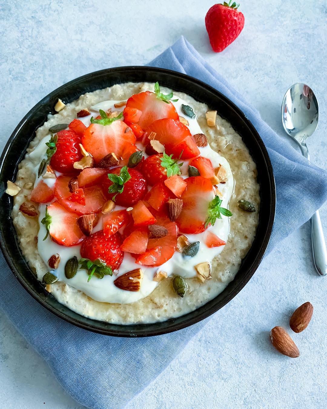 I know bowls like this have been distinctively scarce on my page ? I always feel like you guys aren’t interested in my oatmeal bowls so I usually keep them to myself. I thought I’d share anyway today. It’s a strawberries and ‘cream’ oatmeal bowl with a light drizzle of agave, pumpkin seeds and toasted almonds. The cream is just whipped yoghurt ? Have a wonderful day ❤️ #breakfastbowl #oatsandfruits #plantbasedbreakfast