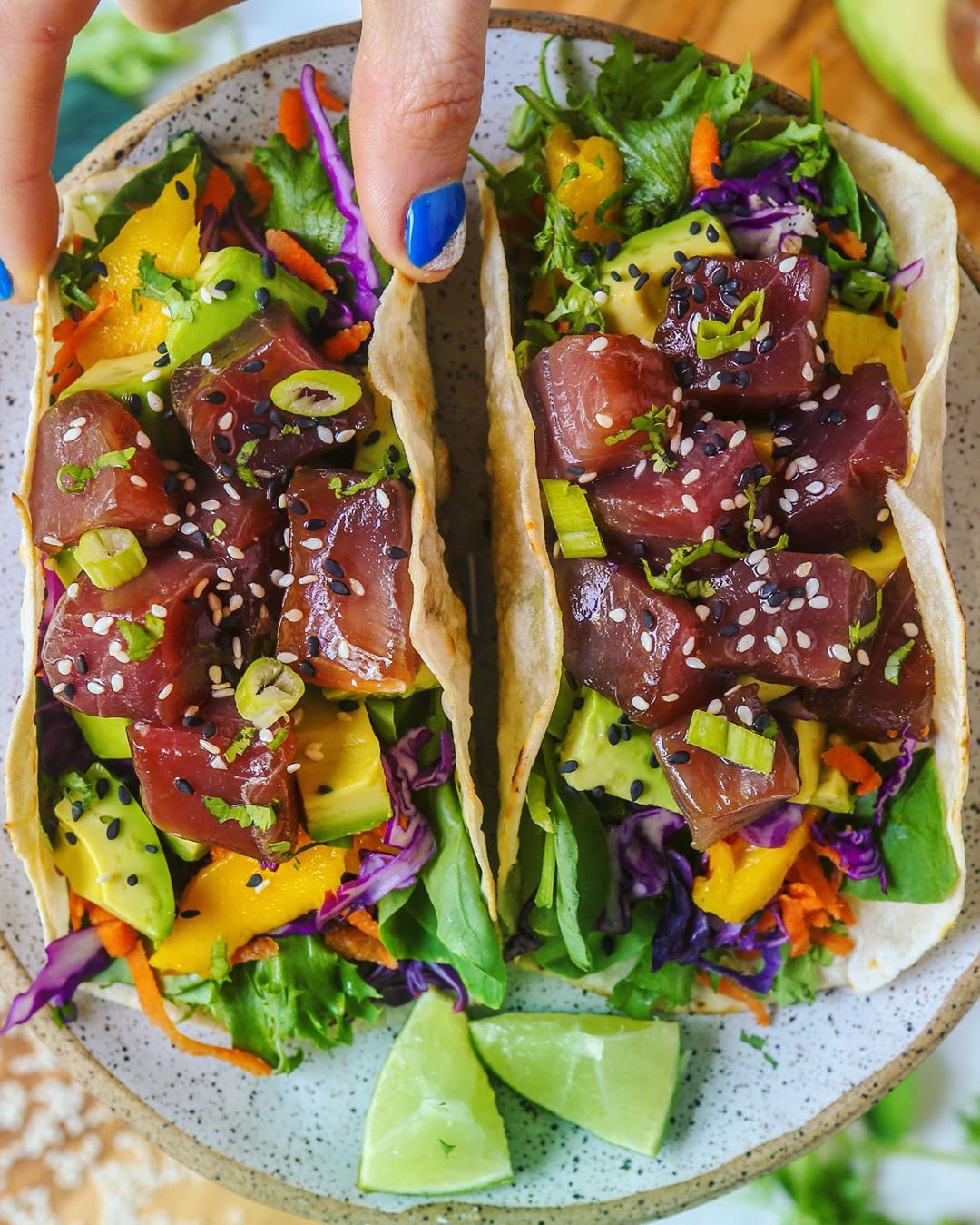 Deets: @sietefoods cassava tortillas, @lef_farms greens, sliced mango, shredded cabbage, shredded carrots, lots of avocado and sashimi grade tuna marinated in 2 tablespoons tamari soy sauce, 1 tablespoon @thrivemarket coconut aminos, and 2 teaspoons of sesame oil. Topped with sesame seeds, cilantro and green onion. •
