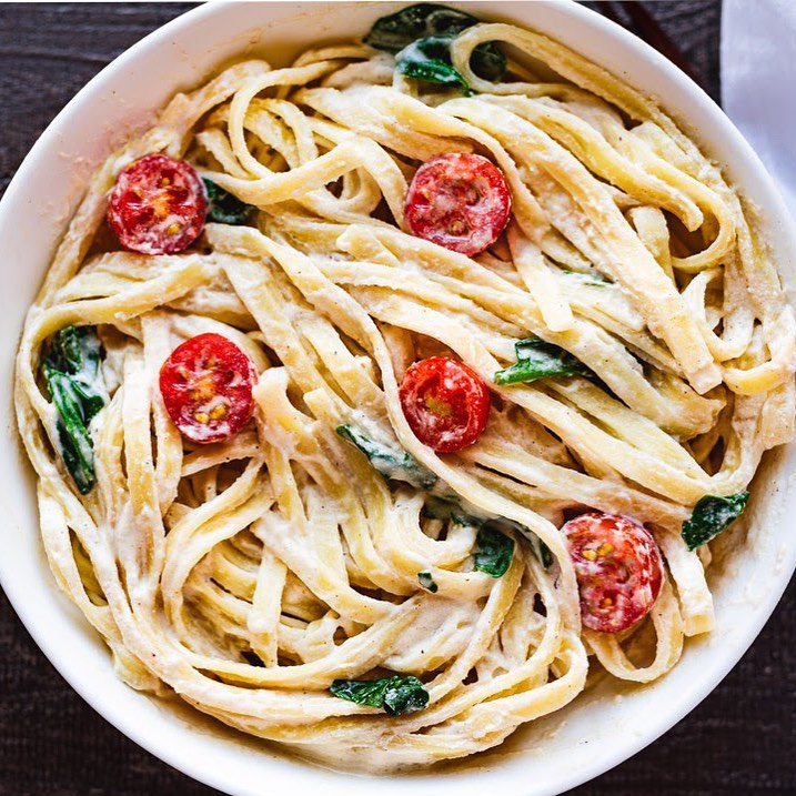 ✅Recipe: You need: ✅Pasta: 6 ounces dried regular or gluten-free fettuccine or any pasta, 4 cups baby spinach, ½ cup grape tomatoes (halved), pinch of ground black pepper. ✅Sauce: 1 cup water, ½ cup white almonds (soaked) or ¾ cup sliced almonds, ½ small zucchini (peeled or unpeeled), ¼ cup pine nuts, juice 1 lime, 1 or 2 garlic cloves (peeled), 1 tbsp onion flakes, 2 tsp cornstarch, 1 tsp grated nutmeg, ½ tsp sea salt. ✅Method: 1. Bring a pot of water to a boil and cook the pasta according to the package instructions. 2. Meanwhile, blend all of the sauce ingredients in a blender until smooth. Transfer to a pot and cook the sauce over high heat for 2 minutes. Stir with a whisk and add ½ cup more water while cooking. 3. Reduce the heat to low and add the spinach to the sauce, then cook for 2 more minutes. 4. Serve the pasta with the sauce, tomatoes, and pepper.