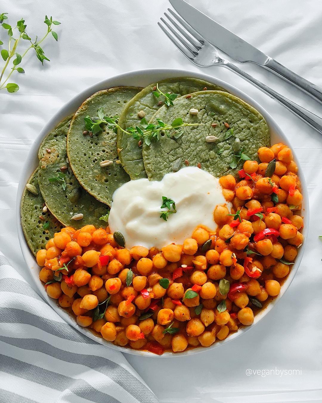 Starting my day sweet and spicy with this super green pancake with spicy chickpe…
