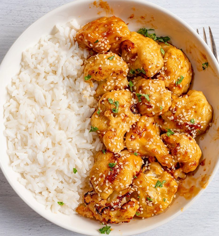 ✅Recipe: Cut 1 small-medium cauliflower into bite-size florets, about 3 cups. ✅In a large bowl, whisk: 3/4 cup of flour (all-purpose is best), 2 tsp garlic powder, 1/2 tsp salt. Slowly add 3/4 cup unsweetened non-dairy milk while stirring. Add cauliflower florets to the bowl and mix them into the batter to coat. ✅Transfer the cauliflower to a lined baking sheet. Bake at 450F for about 20 minutes, or until start to turn golden. Broil for an additional 2-3 minutes to get that extra crisp. ✅Meanwhile, make sauce. Mix: 1 large minced garlic clove, 1/4 cup apricot (or similar flavor) 100% fruit jam, 2 tbsp soy sauce or tamari. Heat sauce in a small-medium skillet and add cauliflower. Continue heating while gently mixing cauliflower until coated in sauce and warmed through, 2-3 minutes. Serve immediately. Top with toasted sesame seeds?.