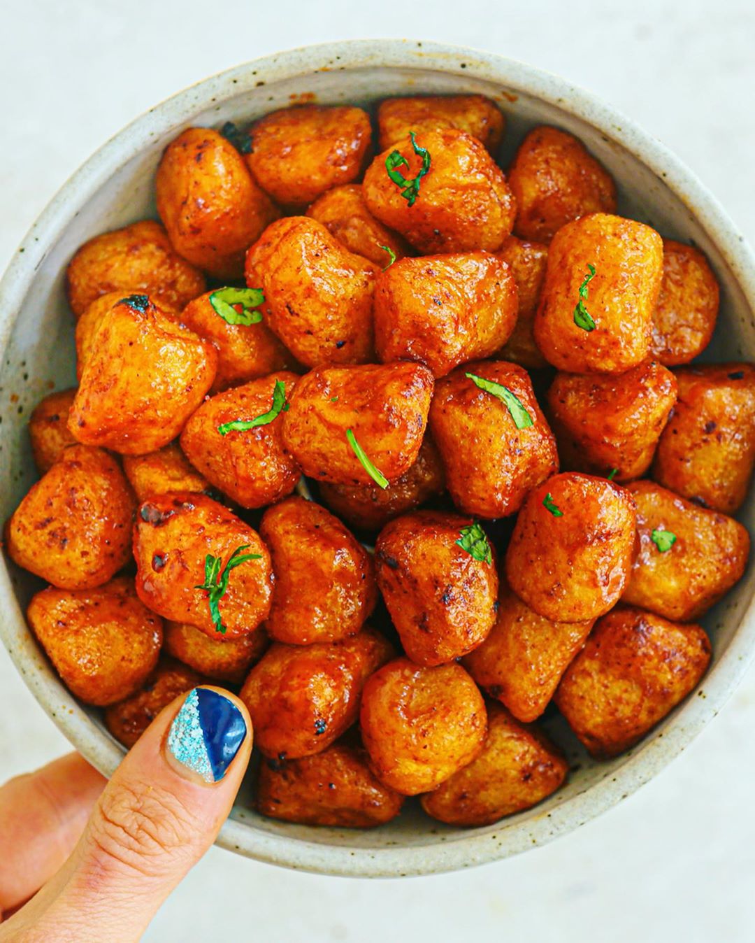 1️⃣ COD: Sauté some chopped onion and chopped garlic for about 2 minutes until soft on medium high heat. Add some baby kale and sauté for another minute then remove from heat. Mix the veggies with a couple tbls of dairy free ricotta (I used @kitehillfoods…could also use regular ricotta or cottage cheese mixed with lemon) and 1/2 tsp lime zest. Lay a thin cod filet flat and place the ricotta mixture in the middle, wrap the filet around it and season with s/p and some coconut aminos. Air fry on a piece of parchment paper on 375 for about 10 minutes. 2️⃣ SAUCE: mix together 3 tbls ketchup, 2 tbls sriracha, 2 tbls maple syrup, 2 tbls coconut aminos, 1 tsp apple cider vinegar, 1/4 tsp each garlic powder, onion powder and cumin. 3️⃣ GNOCCHI: Toss a bag of frozen Trader Joe’s cauliflower gnocchi with 1 teaspoon coconut oil and air fry for about 10 minutes on 400, remove and toss with a couple tbls of the sauce and place back in air fryer for 5 minutes until crispy and glazed. If they aren’t crisp yet then add a couple mins. Add more sauce if you want! **if you are baking them then bake on 425 for 20 minutes (stir them halfway) and remove and add the sauce and bake until crispy. Enjoy!