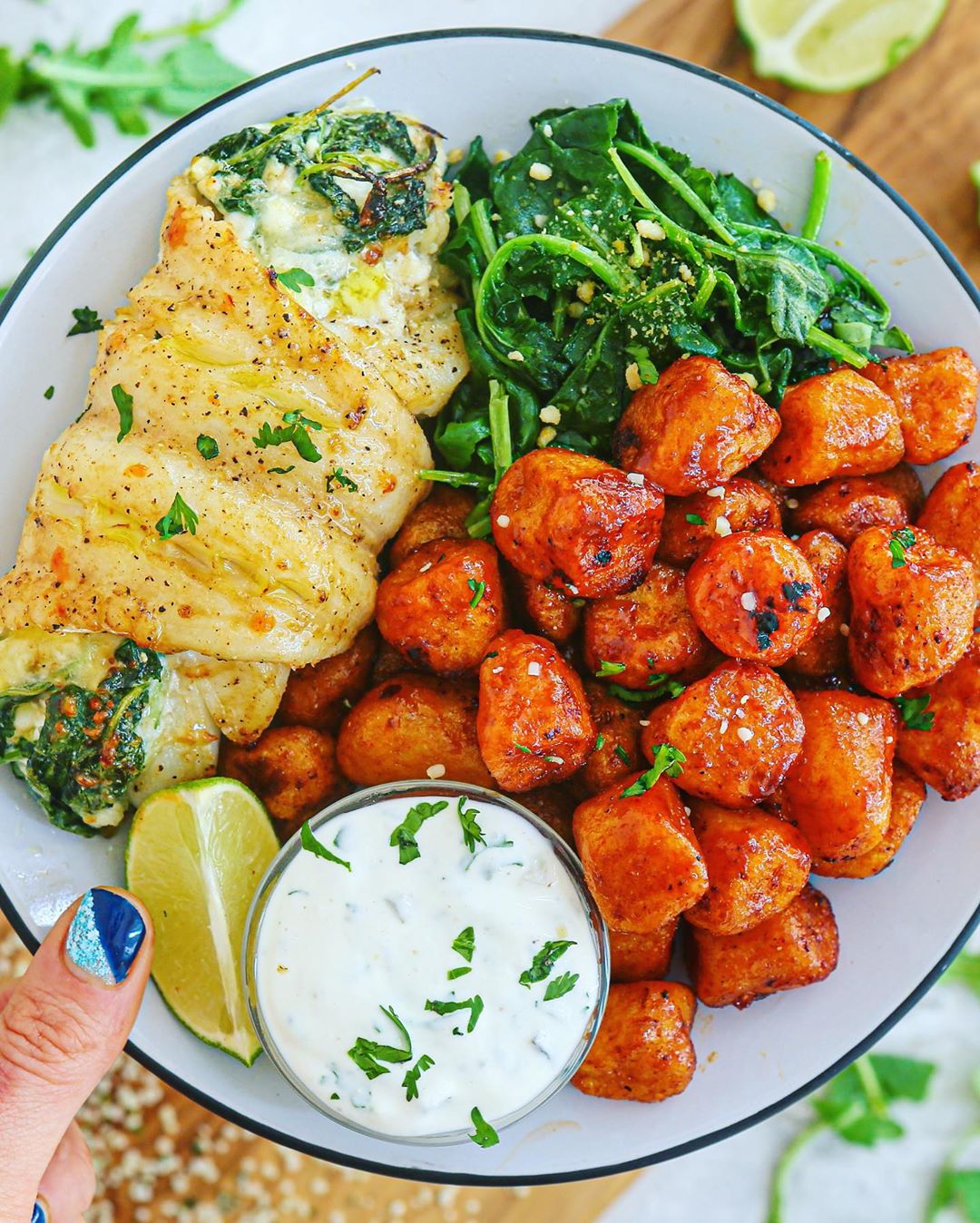 Thursday Eats: RICOTTA LIME STUFFED COD and MAPLE SRIRACHA CAULIFLOWER GNOCCHI with a side of Cilantro Tartar sauce. Happy Thursday loves! Made this for lunch and It was BOMB. Check stories for some prep shots. Doing some more recipe testing today but getting shizzz done. I air fried the cod and gnocchi but you could easily do in the oven. I’m including sauce recipe, but this does make quite a bit of sauce (you only need a little for the gnocchi). However, it makes a great marinade for chicken and fish and potatoes! How is everyone’s week going? Any big plans this weekend?