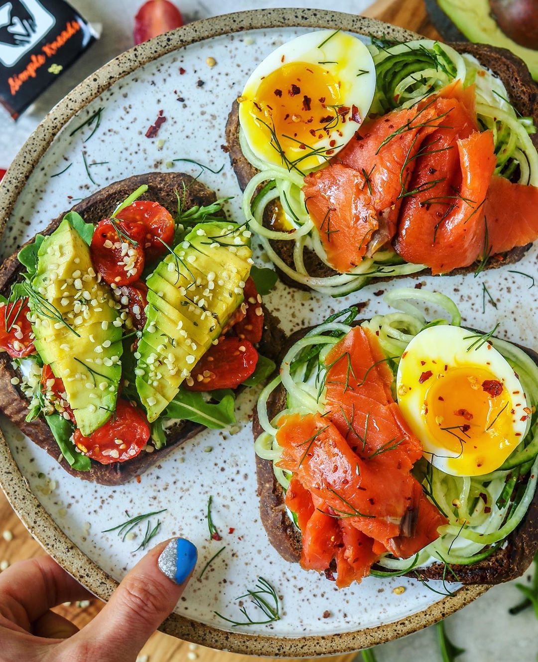 Deets: 3 slices @simplekneads_gf pumpernickel bread toasted in ghee. All topped with dairy free almond milk cream cheese. 2 with spiralized cucumber, smoked salmon and half a soft boiled egg. 1 with arugula, roasted tomatoes, avocado and hemp seeds. Garnished with some fresh dill and red pepper flakes. •