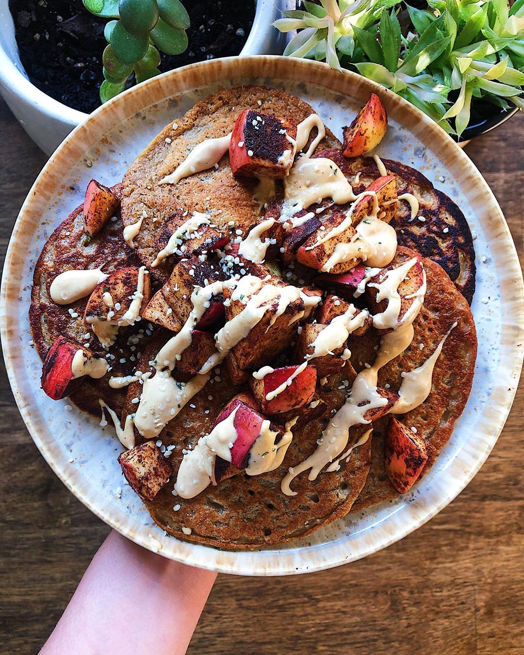 Combine 2 bananas, 1.5 cups of oats, 1 tsp apple cider vinegar, 1 tsp baking soda, 1 tbsp maple syrup, 1.5 cups of plant-based milk + 1 tsp vanilla in a high speed blender and blend until smooth. Cook like regular pancakes. While the pancakes are cooking, sauté 1 chopped apple in a tsp of cinnamon and a splash of maple syrup until softened and golden. Serve together with peanut butter, maple syrup + enjoy!