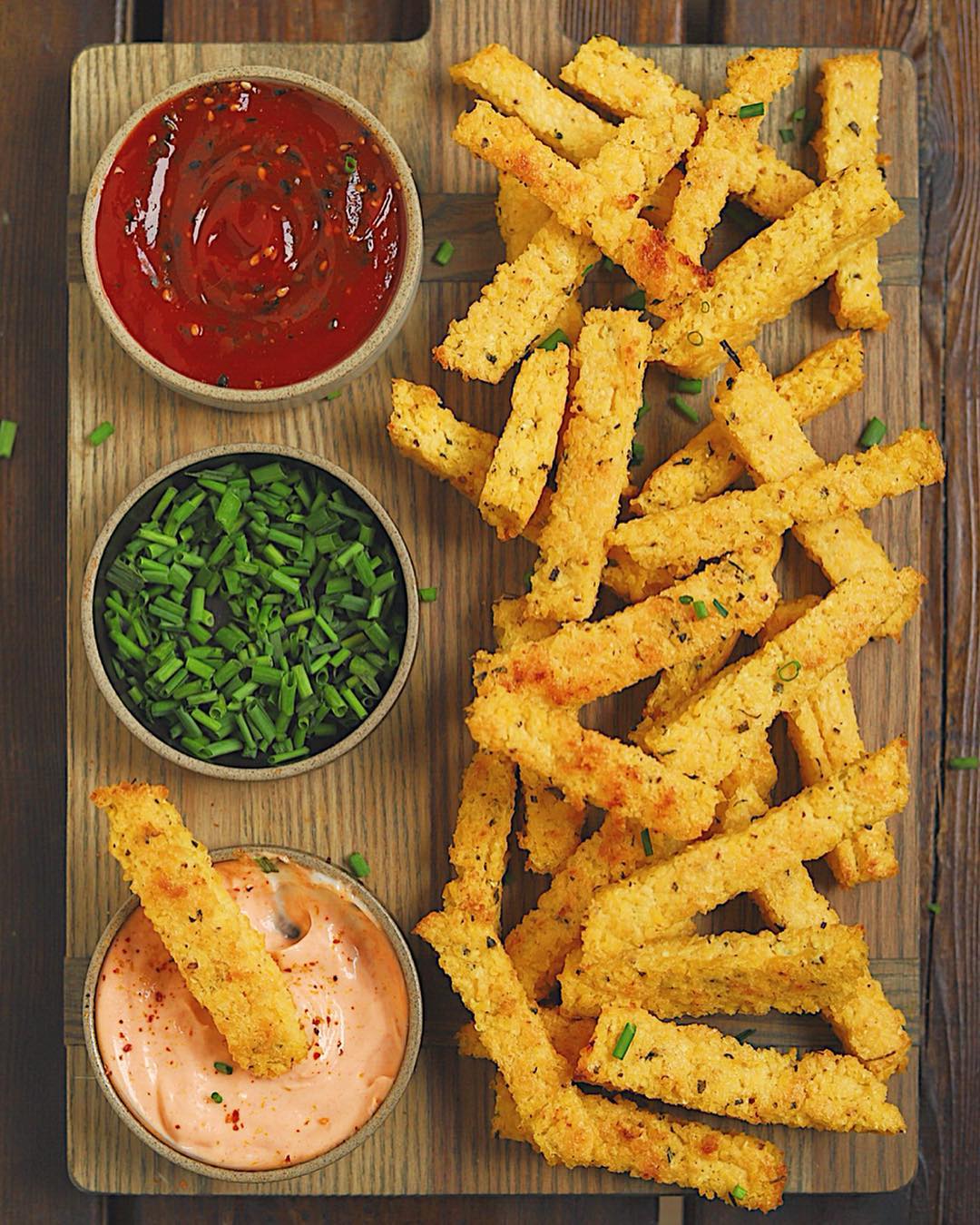 1️⃣ Soak cornmeal with water in large bowl for 2 hours 2️⃣ On stovetop, pour cornmeal & water into large saucepan, bring to a boil on high, then set to low stirring with a whisk every couple of minutes for about 30 min 4️⃣Turn off heat,add the rest of ingredients, mix well 5️⃣Pour mix onto parchment lined baking pan( 9×13 in, or similar size), let set for at least an hour until firm 6️⃣Cut into desired fry shape using knife( 3 in x 1/2 in wide) carefully place fries onto large parchment lined baking sheet, mist with oil 7️⃣Bake corn fries at 425 degrees for 30 min , flipping at the 20 minute mark. Add more seasoning in herbs if desired. Serve with your favorite fry dipping sauces. I served mine with sriracha mayo and ketchup/ sprinkled with furikake, & some chives. Swipe left and you will see how to cut out the fries & what they look ? like before baking ?