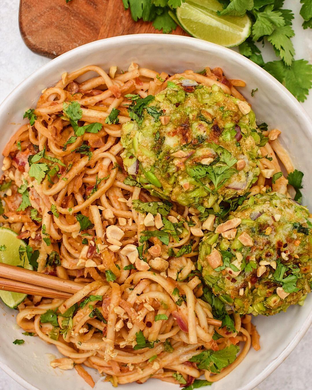 CURRY PEANUT NOODLES WITH EDAMAME FRITTERS ! So delish and exactly what I neede…