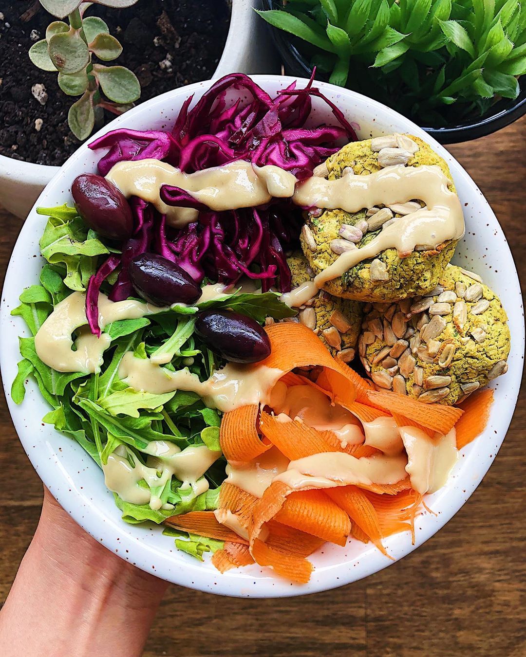 Preheat oven to 450F. Drain and rinse a can of chickpeas. Add to a food processor or high speed blender with a tamper, along with 1/4 packed cup of parsley, 1/4 packed cup of arugula (optional), 1 small onion, diced, 3 cloves of garlic, 1 tsp cumin, 1 tsp coriander, 1/2 tsp cardamom + a large pinch each of salt and pepper. Blend until relatively smooth, using the tamper to help it blend. Roll “dough” into balls, sprinkle with sesame or sunflower seeds, then place on baking sheet with parchment paper and flatten to about 3/4 inch thick. Bake for 20 minutes, flipping half way between. Serve with veggies of your choice- I chose arugula, red onion, red cabbage, kalamata olives. Top with a tahini-lemon drizzle (recipe in my FREE Ebook- get my clicking the link in my bio!) Enjoy! ?