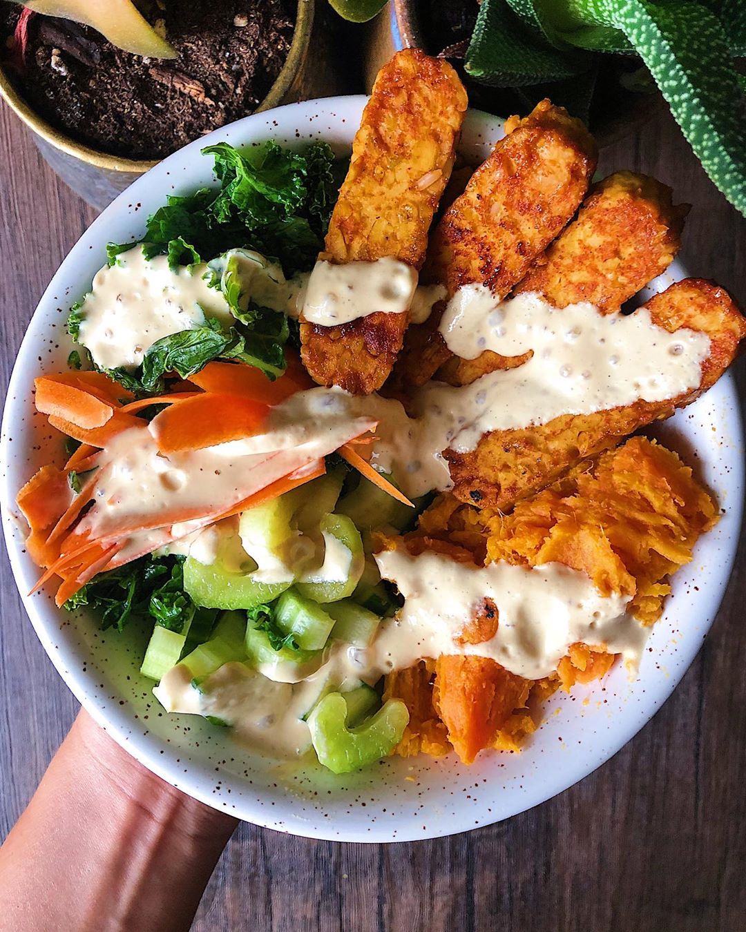 Smoky tempeh (recipe a few posts back) with massaged kale, steamed (aka microwaved) sweet potato, quick-pickled carrots, cucumber, celery and my savory sauce ✨