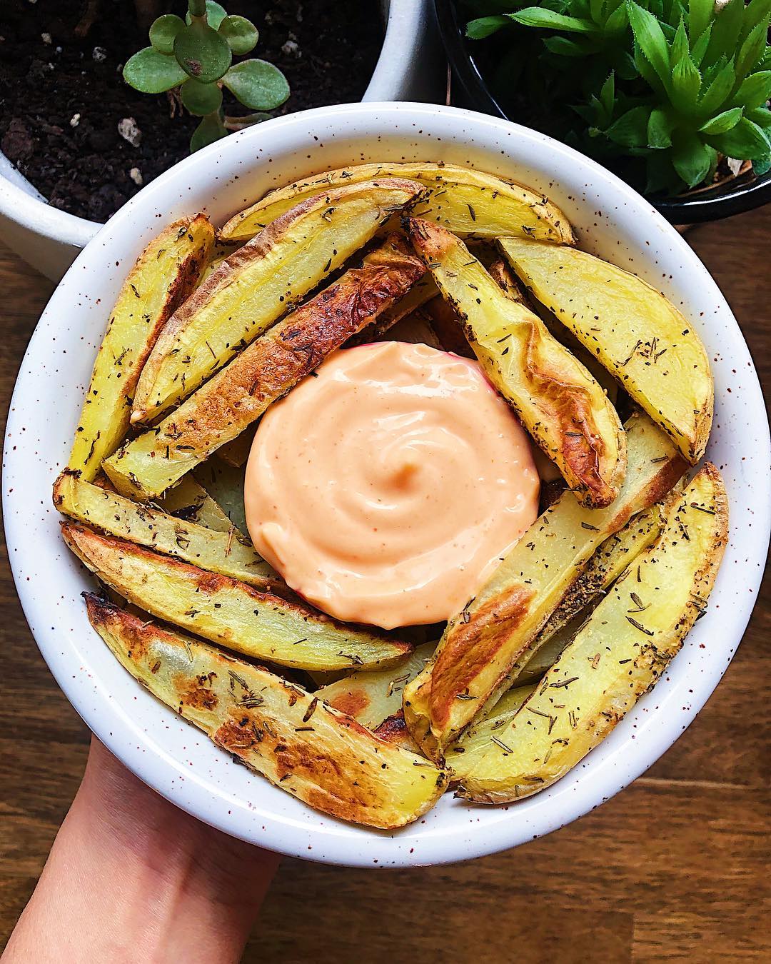 Fry deets ??: yellow potatoes cut into fry shapes + tossed with garlic powder, thyme + salt and baked at 450 F for 25 minutes. Make sriracha aioli by mixing 1 tbsp vegan mayo, 1/2 tsp sriracha + the juice of 1/2 lime ✨